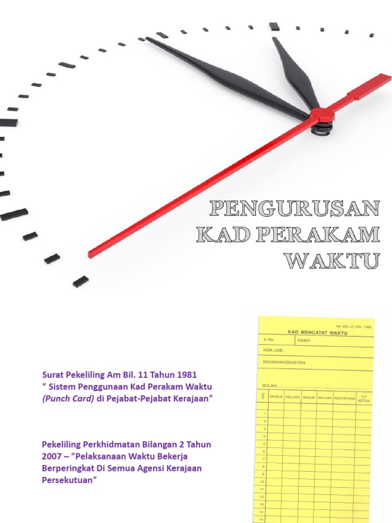 Sistem Penggunaan Kad Perakam Waktu Punch Card di Pejabat-Pejabat Kerajaan Adalah dimaklumkan bahawa Kerajaan telah memutuskan supaya semua pejabat dan agensi Kerajaan di peringkat Persekutuan menggunakan kad perakam waktu untuk mengawal waktu pegawai-pegawai dan kakitangan kerajaan datang dan pulang dari pejabat. Sistem Penggunaan Kad Perakam Waktu Punch Card di Pejabat-Pejabat Kerajaan Adalah dimaklumkan bahawa Kerajaan telah memutuskan supaya semua pejabat dan agensi Kerajaan di peringkat Persekutuan menggunakan kad perakam waktu untuk mengawal waktu pegawai-pegawai dan kakitangan kerajaan datang dan pulang dari pejabat. Sehubungan itu agensi Kerajaan adalah dibenarkan mengguna Sistem Perakam Waktu Elektronik bagi maksud tersebut.